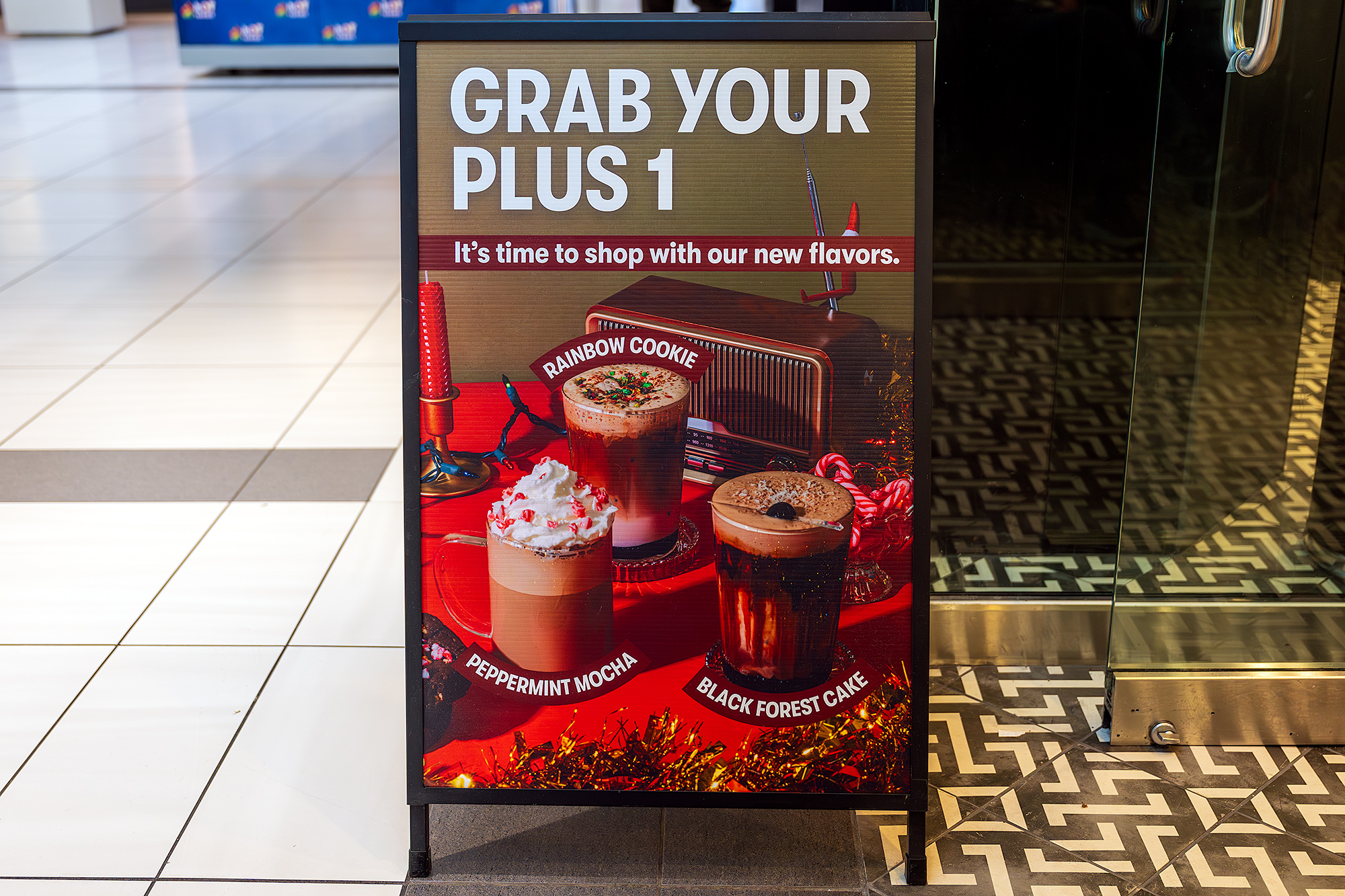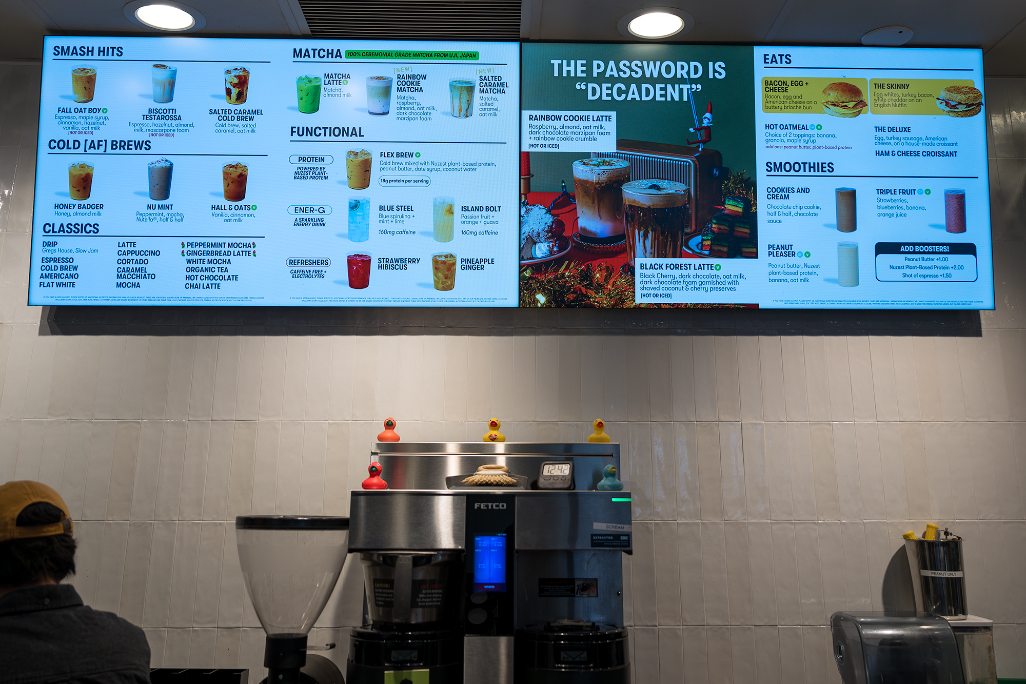 We took some fun holiday snaps near the seasonal merch and decor. People flowed in and out in a busy mall. There were other coffee places competing for their attention, but what brought them here? Was it the coffee quality? The expertly handcrafted drinks? The fresh baked goods made daily right here? The personal touch instead of a faceless, blinking menu board with a disembodied voice crackling through a speaker?