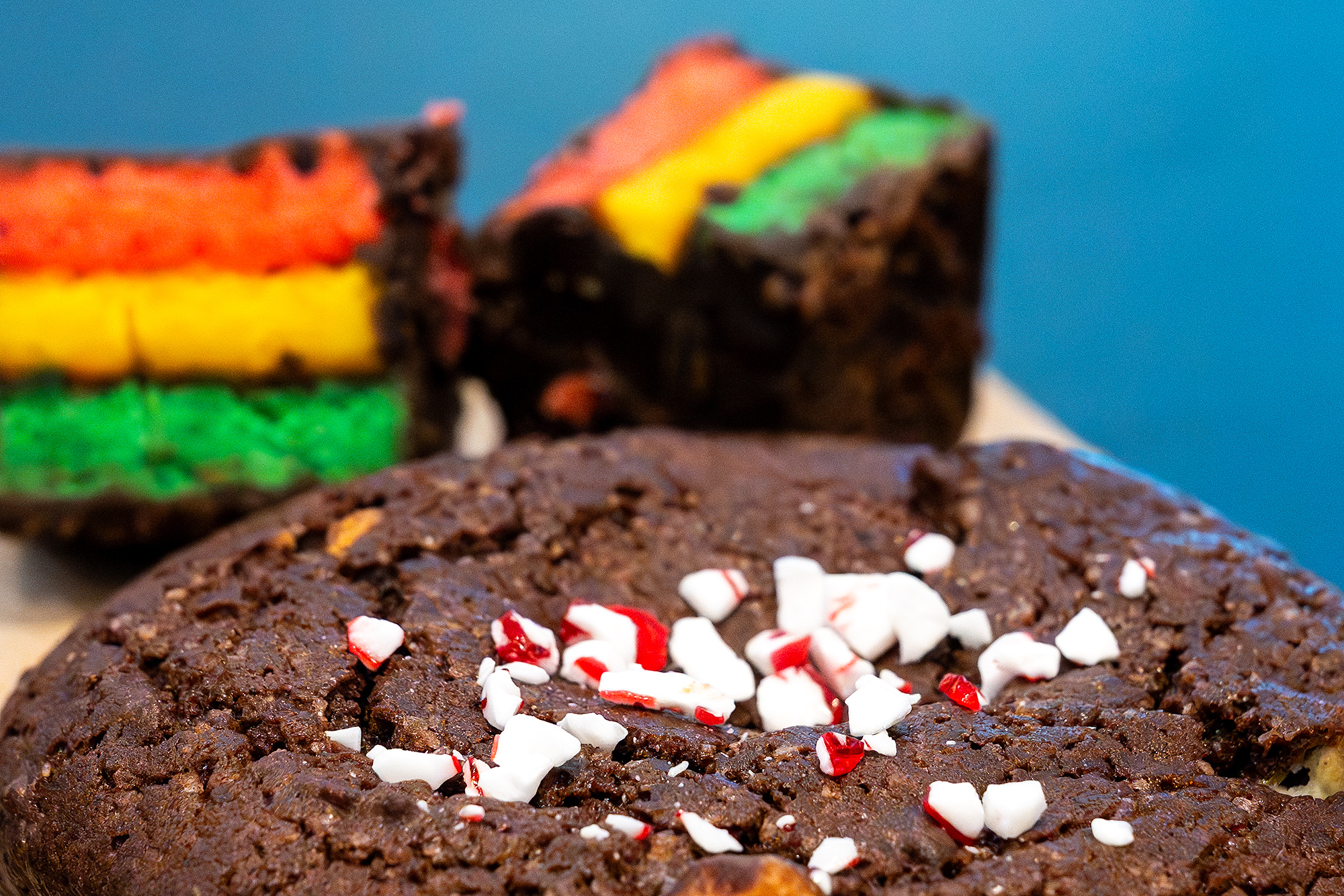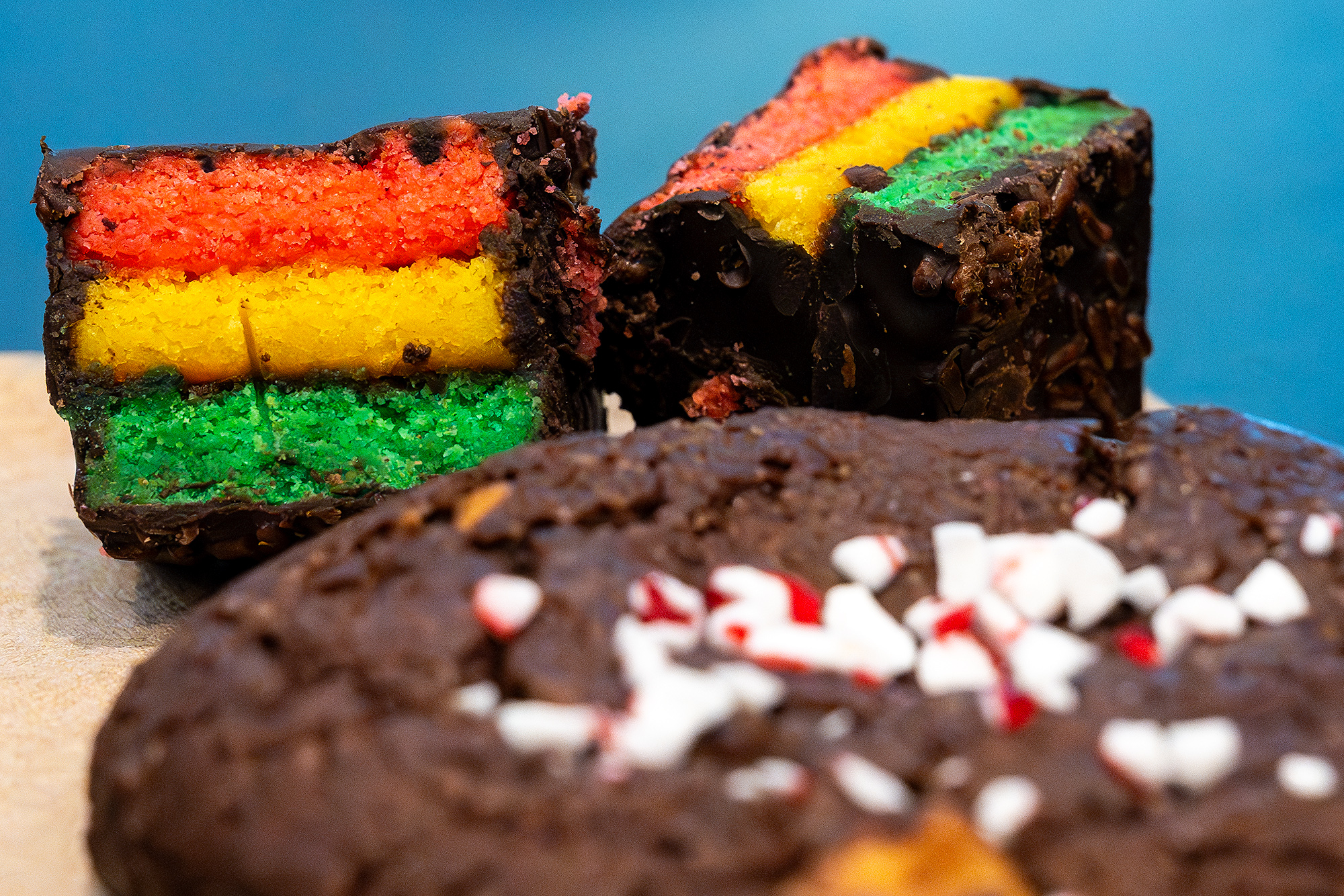 The joint was jumpin’. Seasonal and holiday food and drinks were lighting up the boards, and cool merch was hot and going out of stock. We headed to the pass with a full menu of our own new favorites. My mom ordered: Biscotti Testarossa and Pistachio Muffin. Lisa set the baseline with: Peppermint Mocha and Spinach Ricotta Croissant. My eyes were big for: Iced Black Forest Latte, Triple Chocolate Chip Cookie, and Rainbow Cookie (like a Holiday Triple-Layer Cake). We found a corner table and settled in the relaxed environment.